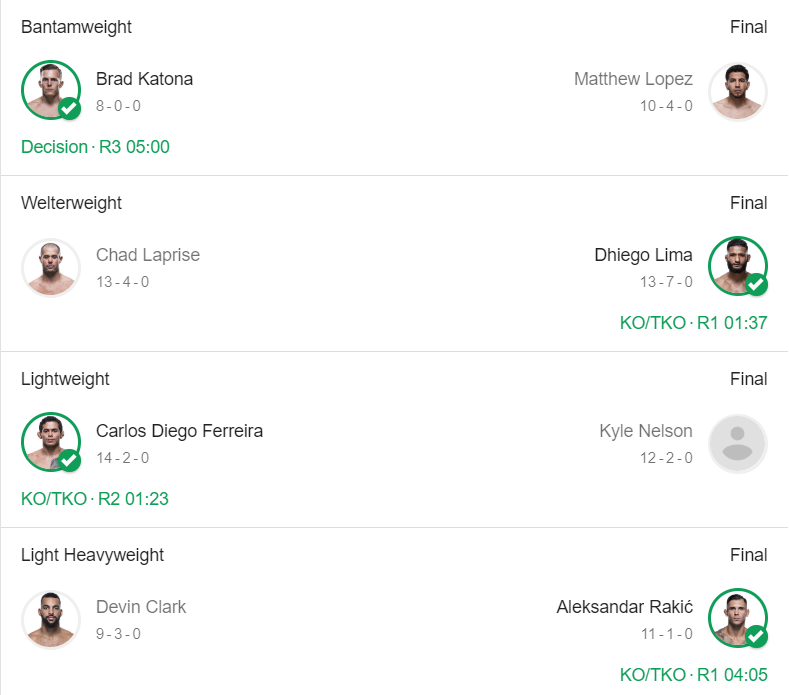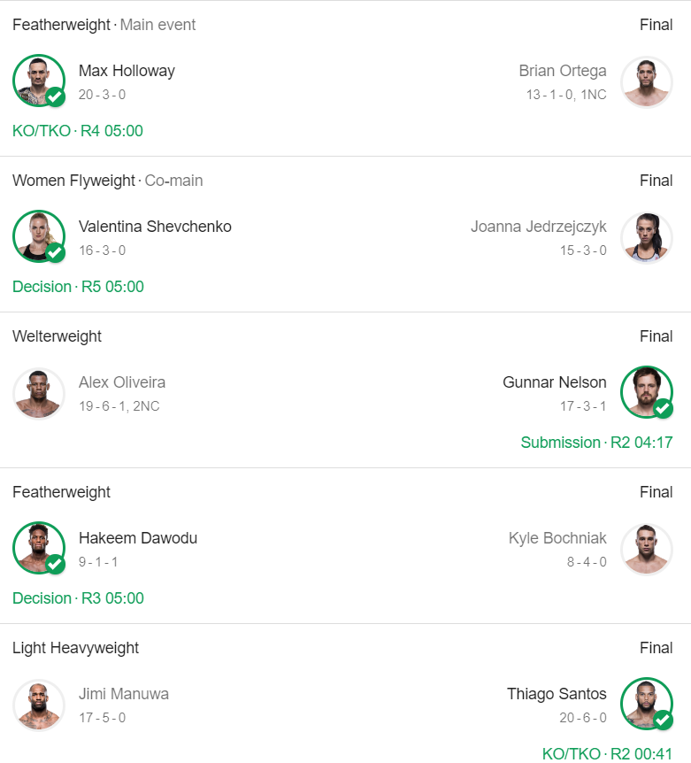 Bătălia a fost una superbă care s-a terminat cu TKO la sfârșitul Rundei 4, moment în care doctorul a oprit lupta între runde, deoarece Brian Ortega nu mai putea vedea cu ochiul său stâng. Max Holloway își păstrează centura de campion și urmează să vedem cu cine se va lupta în următoarea partidă. Khabib Nurmagomedov, Tony Ferguson sau poate chiar Conor Mcgregor? Voi pe cine ați paria?